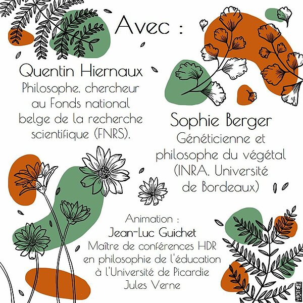 Rencontre autour de l'ouvrage Philosophie du végétal (Vrin, 2018), avec Quentin Hiernaux, philosophe, chercheur au Fonds national belge de la recherche scientifique (FNRS) et Sophie Gerber, généticienne et philosophe du végétal (INRA, Université de Bordeaux). Animée par Jean-Luc Guichet, maître de conférences HDR en philosophie de l'éducation à l'Université de Picardie Jules Verne.