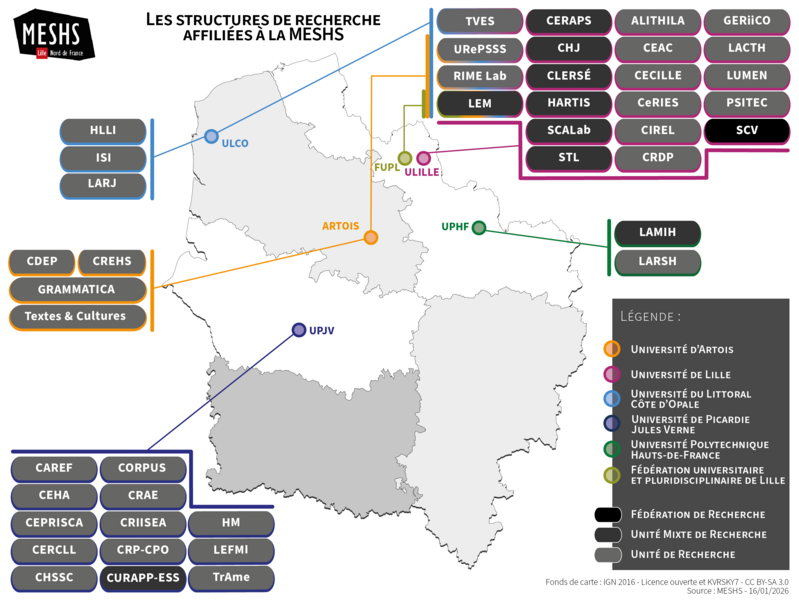 La MESHS fédère une communauté scientifique composée, en 2026, de 43 structures de recherches réparties sur l'ensemble de la région Hauts-de-France, toutes disciplines confondues en sciences humaines et sociales, soit environ 2 000 chercheuses et chercheurs permanents (professeures et professeurs, maîtresses et maîtres de conférences, directrices et directeurs de recherche et chargé-e-s de recherche CNRS).