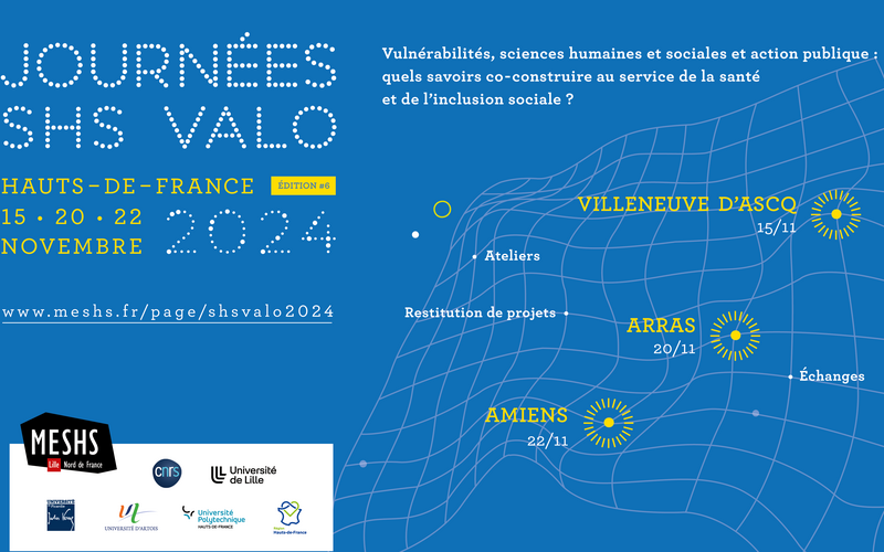 Les Journées SHS Valo en Hauts-de-France sont un rendez-vous régional annuel itinérant réunissant différents acteurs (chercheurs, doctorants, entreprises, collectivités, associations, etc.). Soutenues depuis leur création en 2018 par le Conseil Régional Hauts-de-France, ces rencontres scientifiques et professionnelles visent à échanger sur les pratiques, nouer des liens et développer des partenariats nouveaux. Ces journées ont pour ambition également, à partir d'exemples de projets de recherche partenariaux financés par la MESHS et/ou par les universités du territoire, souvent co-financés par des partenaires complémentaires, de mettre en avant les bonnes pratiques de valorisation et de co-construction des recherches en SHS, dans des disciplines variées.
